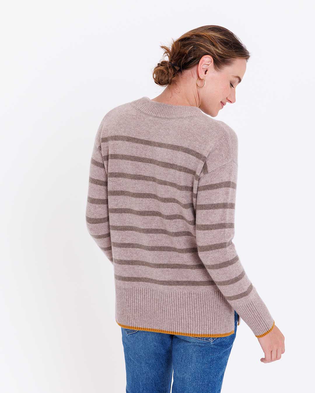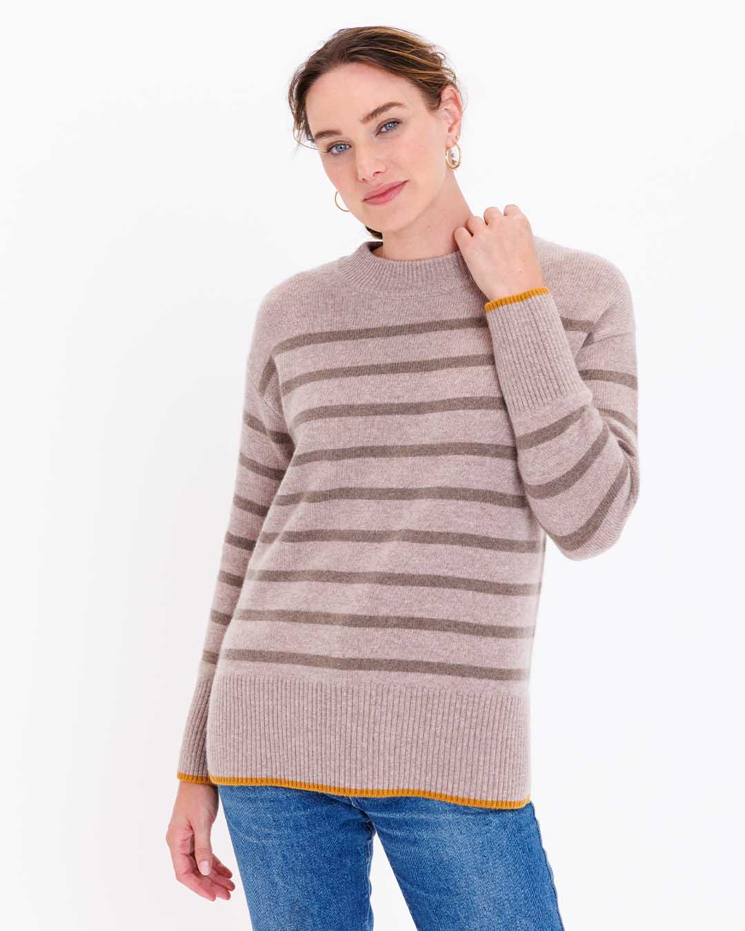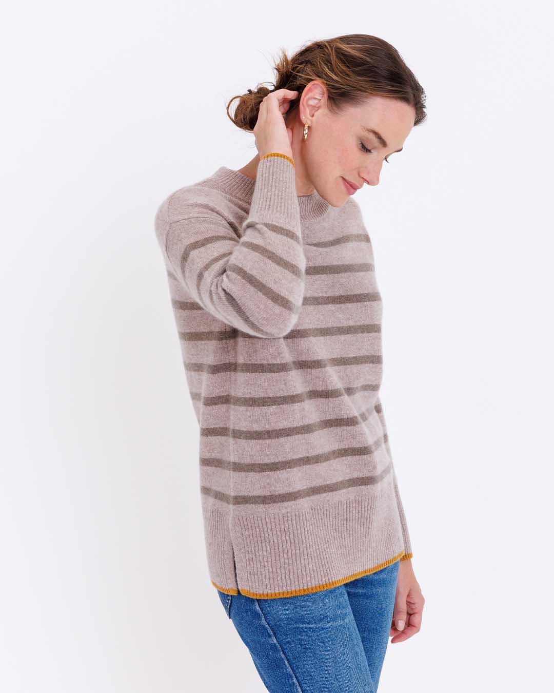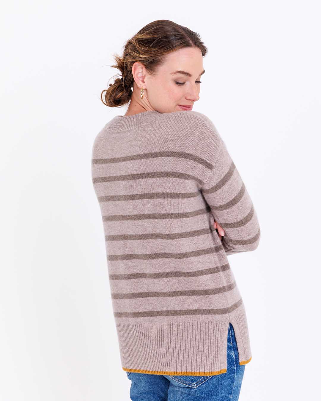 Step into style with our Bexley Striped Crew—a luxurious cashmere sweater that fuses eye‐catching mid‐chest stripes with a drop shoulder and tunic length silhouette. Designed in versatile color palettes with elegant tipping accents, it delivers refined comfort and effortless sophistication all day long.