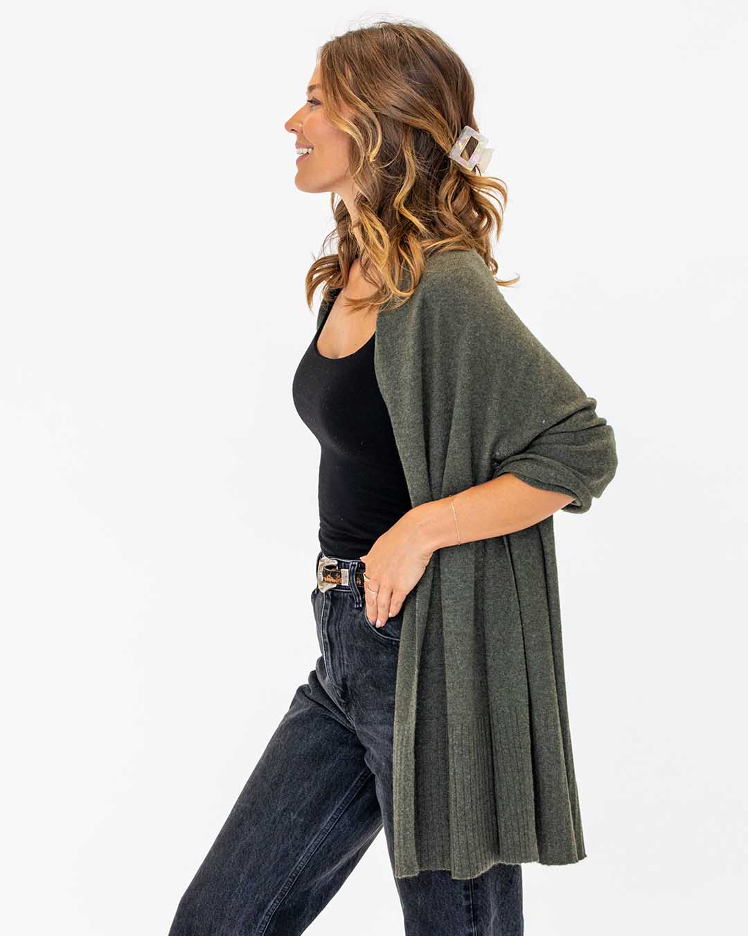 Embrace warmth and elegance with our 100% Cashmere Travel Wrap. Perfect for chilly evenings, its sleek vertical rib hem and generous dimensions provide both practicality and style. This wrap is an essential layering piece that effortlessly combines luxury with everyday wearability.