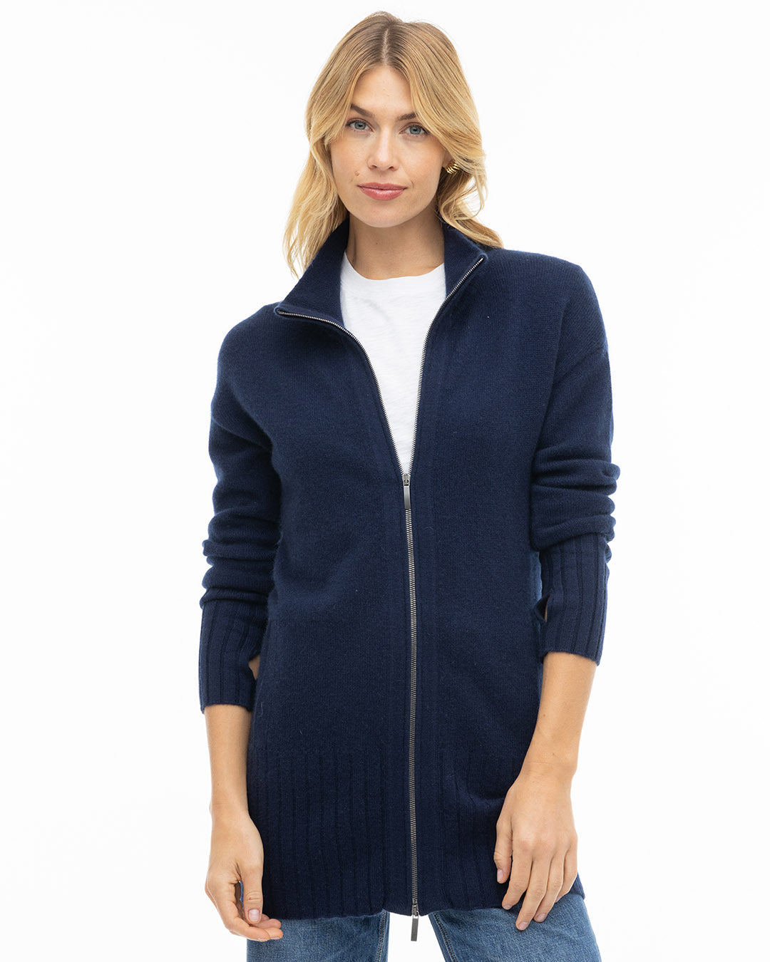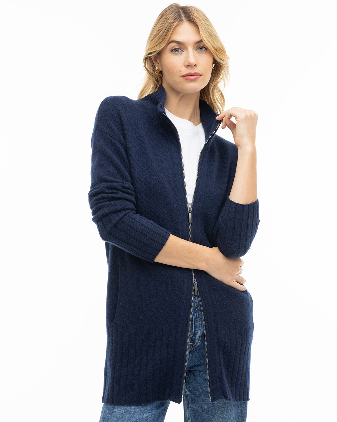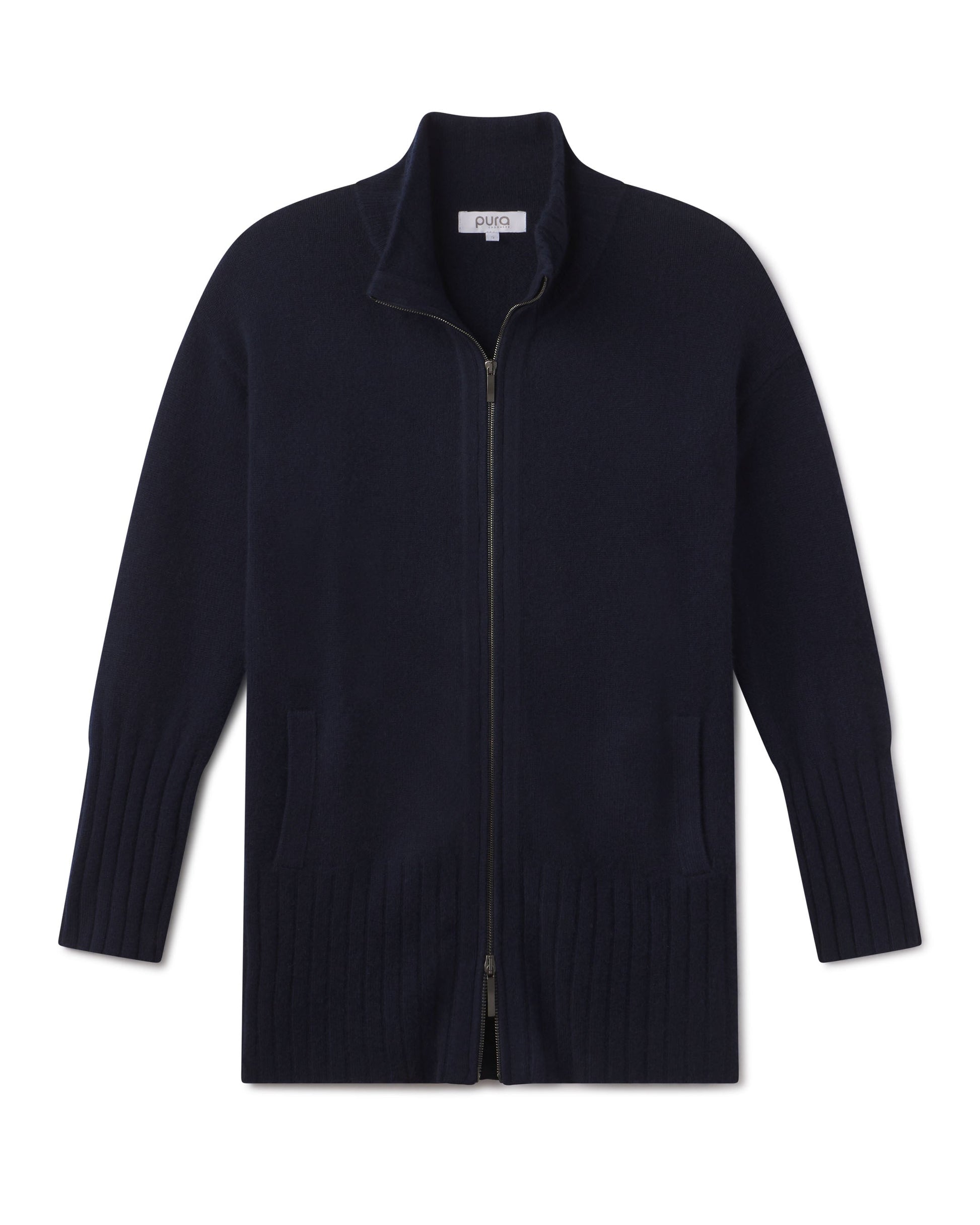 Wrap yourself in the everyday luxury of our Cashmere Zip-Up Cardigan, a refined yet practical staple for any season. Made from certified grade-A 100% cashmere, it offers unmatched softness, warmth, and effortless style. Designed with a double-zip front, deep pockets, and a high ribbed mock collar, this versatile cardigan flatters every body shape with its relaxed fit and clean lines. Perfect for layering at the office, at home, or out on the town. For a more tailored look, consider sizing down.