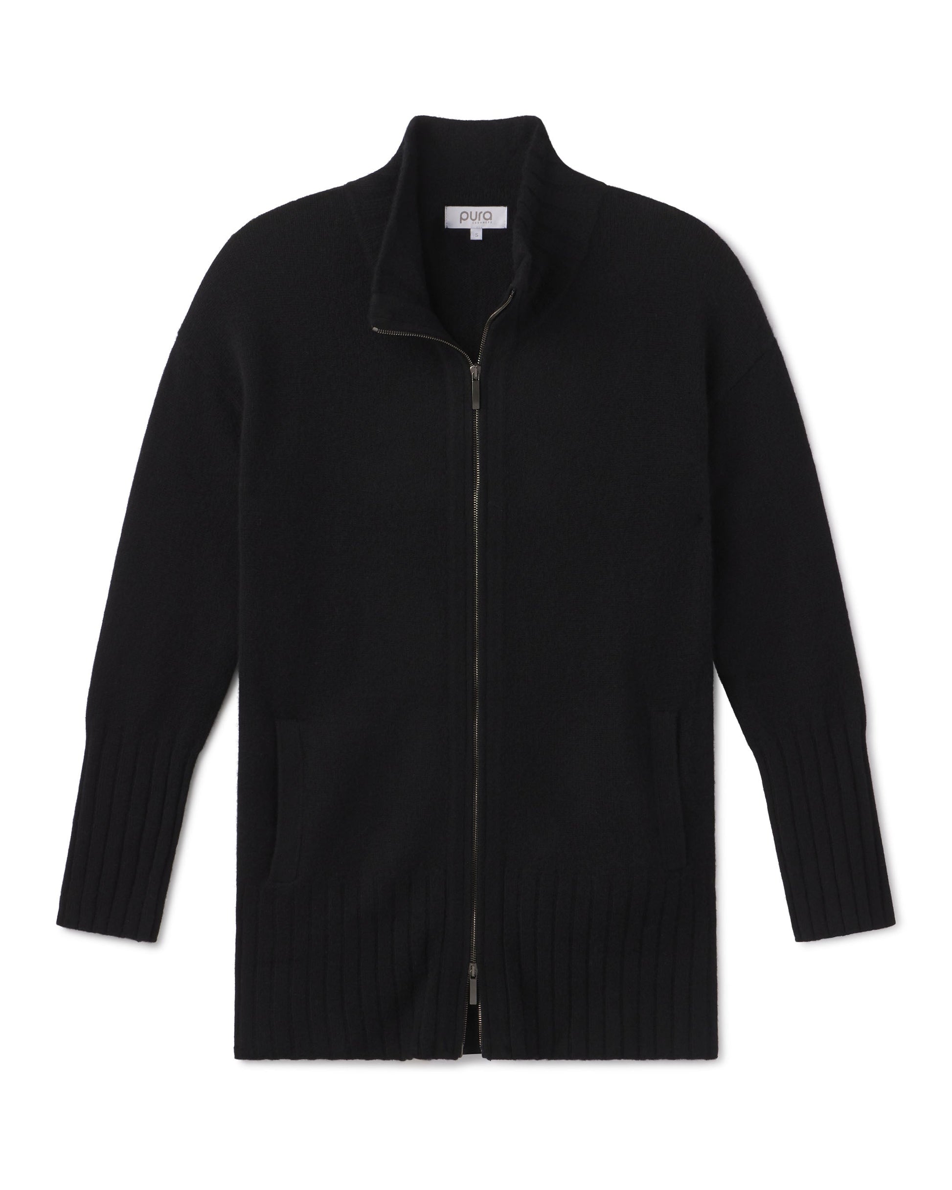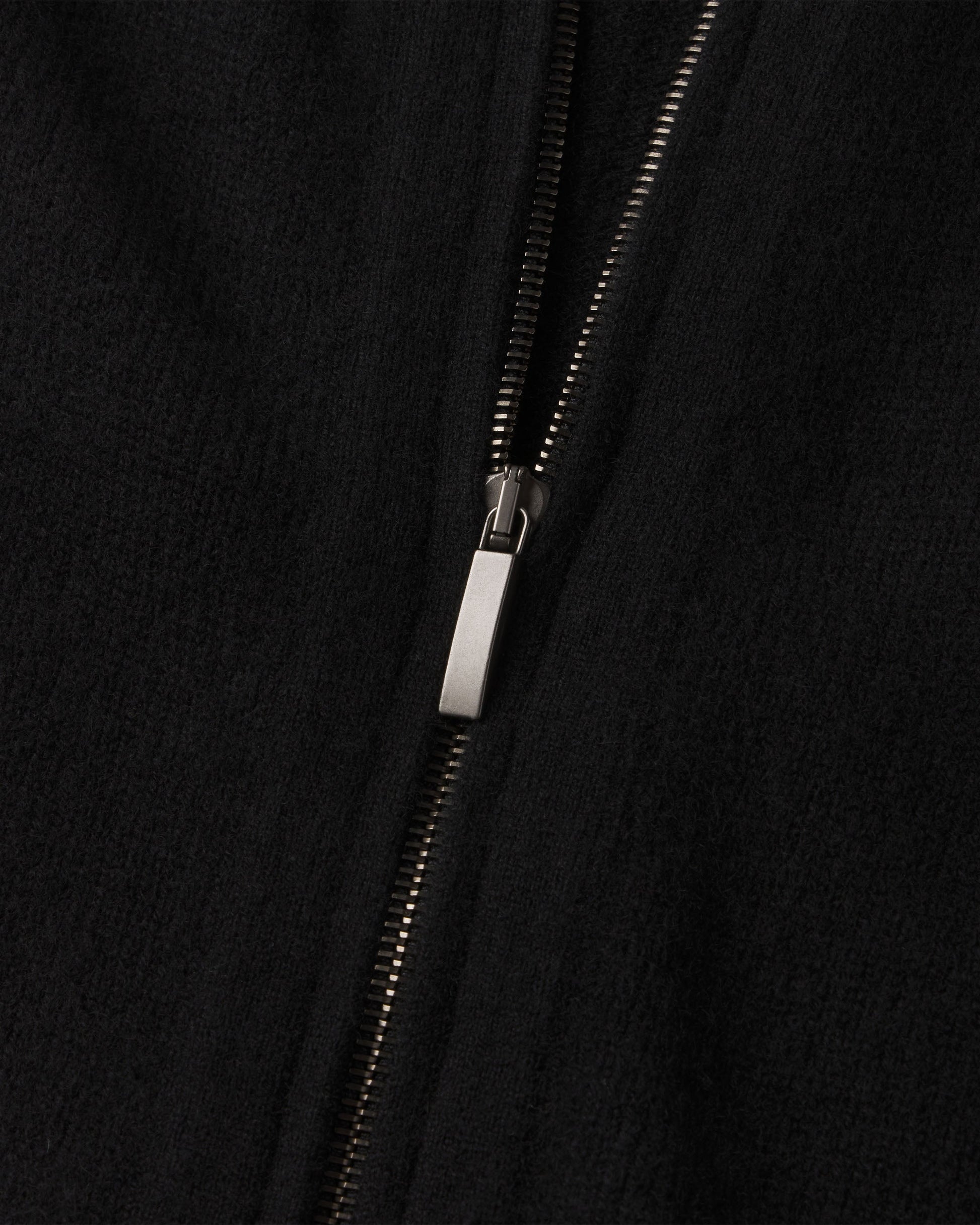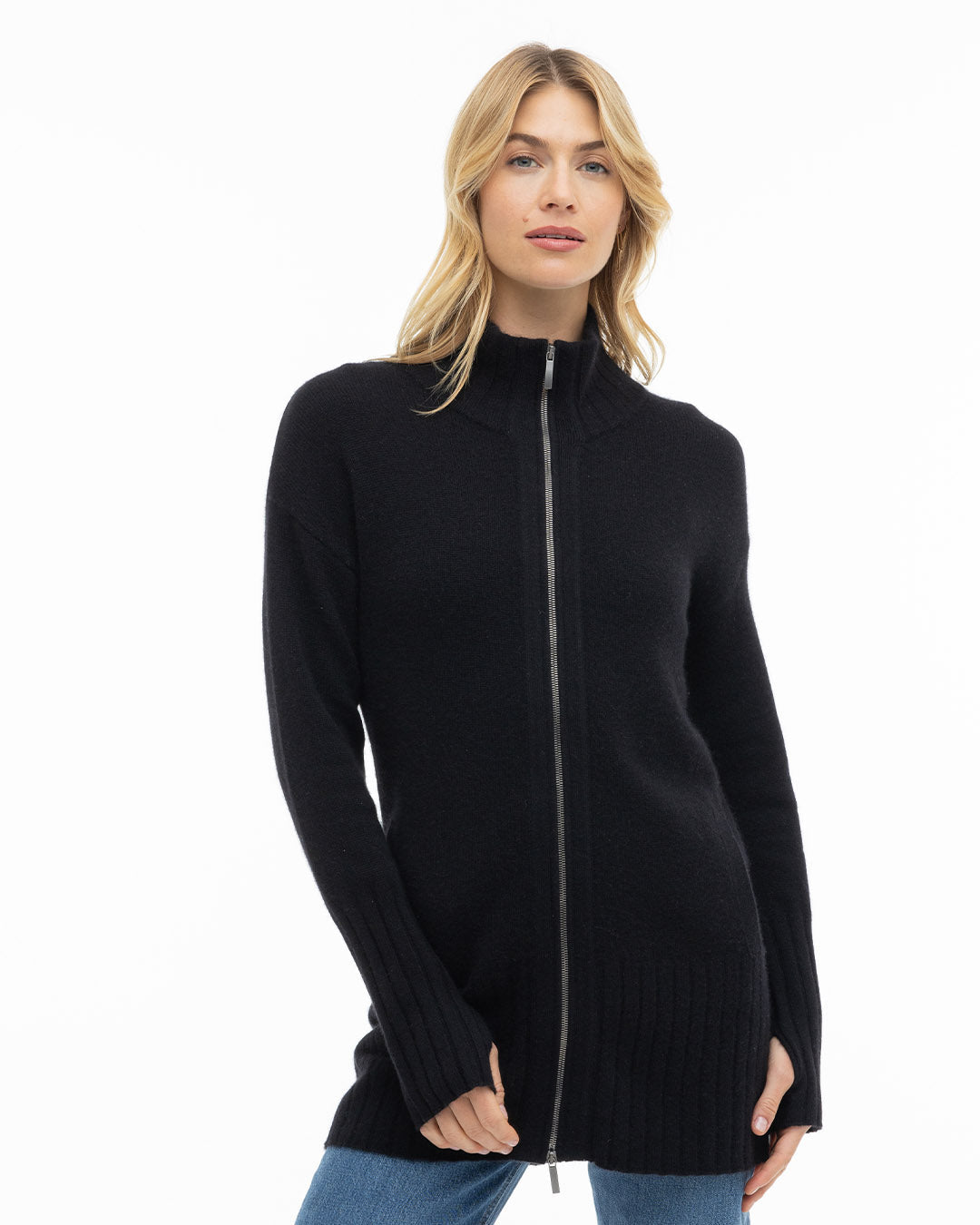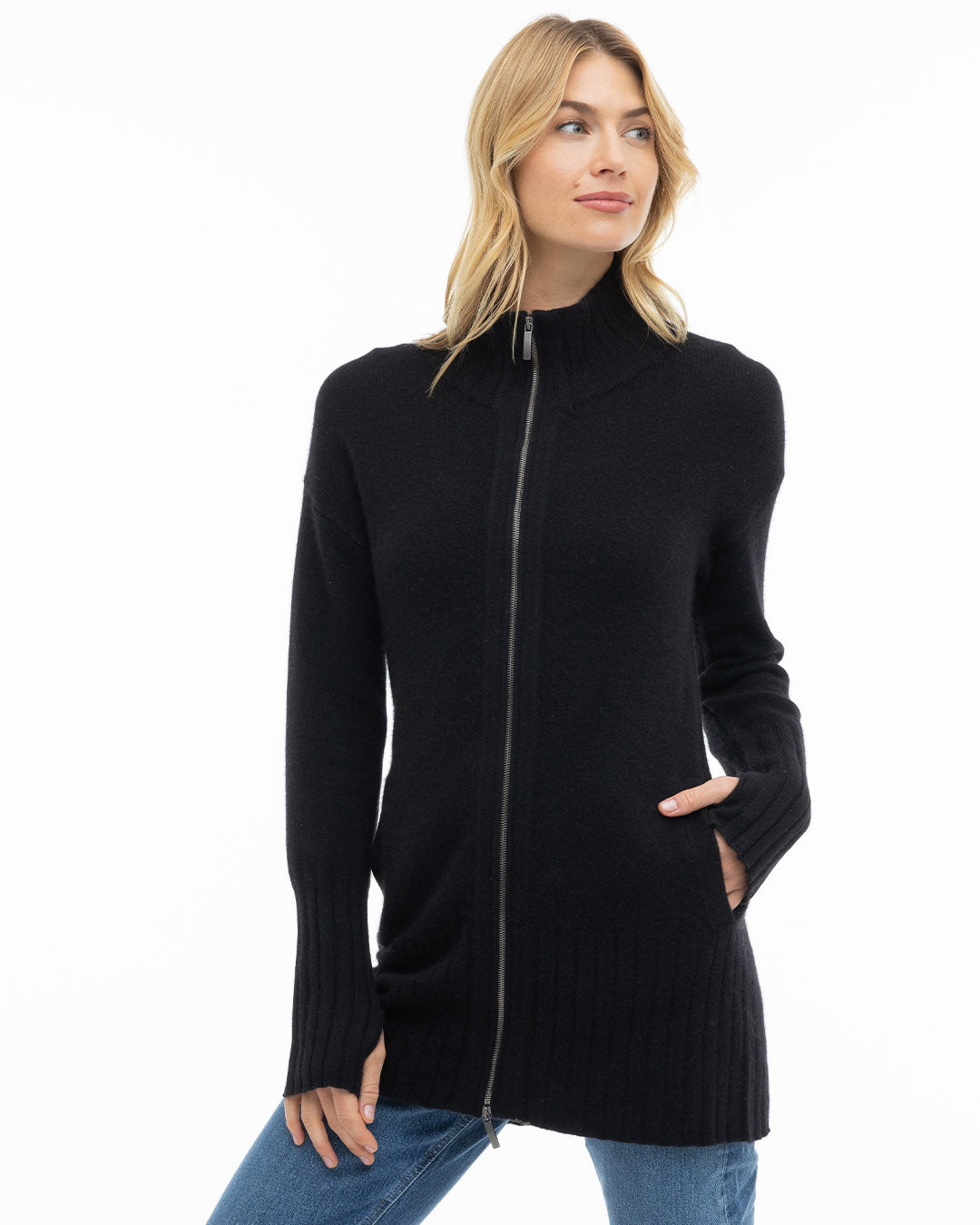 Wrap yourself in the everyday luxury of our Cashmere Zip-Up Sweater, a refined yet practical staple for any season. Made from certified grade-A 100% cashmere, it offers unmatched softness, warmth, and effortless style. Designed with a double-zip front, deep pockets, and a high ribbed mock collar, this versatile cardigan flatters every body shape with its relaxed fit and clean lines. Perfect for layering at the office, at home, or out on the town. For a more tailored look, consider sizing down.
