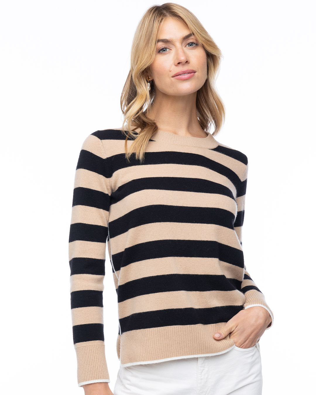 Add a bold touch to your wardrobe with our Contrast Striped Crew, a playful take on classic collegiate style. Crafted from sustainably sourced 100% pure cashmere, its ultra-soft feel meets eye-catching two-color stripes and contrast piping for a vibrant, statement-making look. Energetic and effortlessly chic, it’s a sweater designed to stand out.