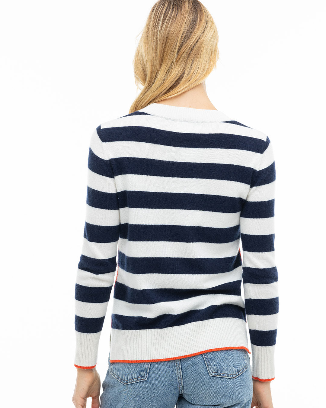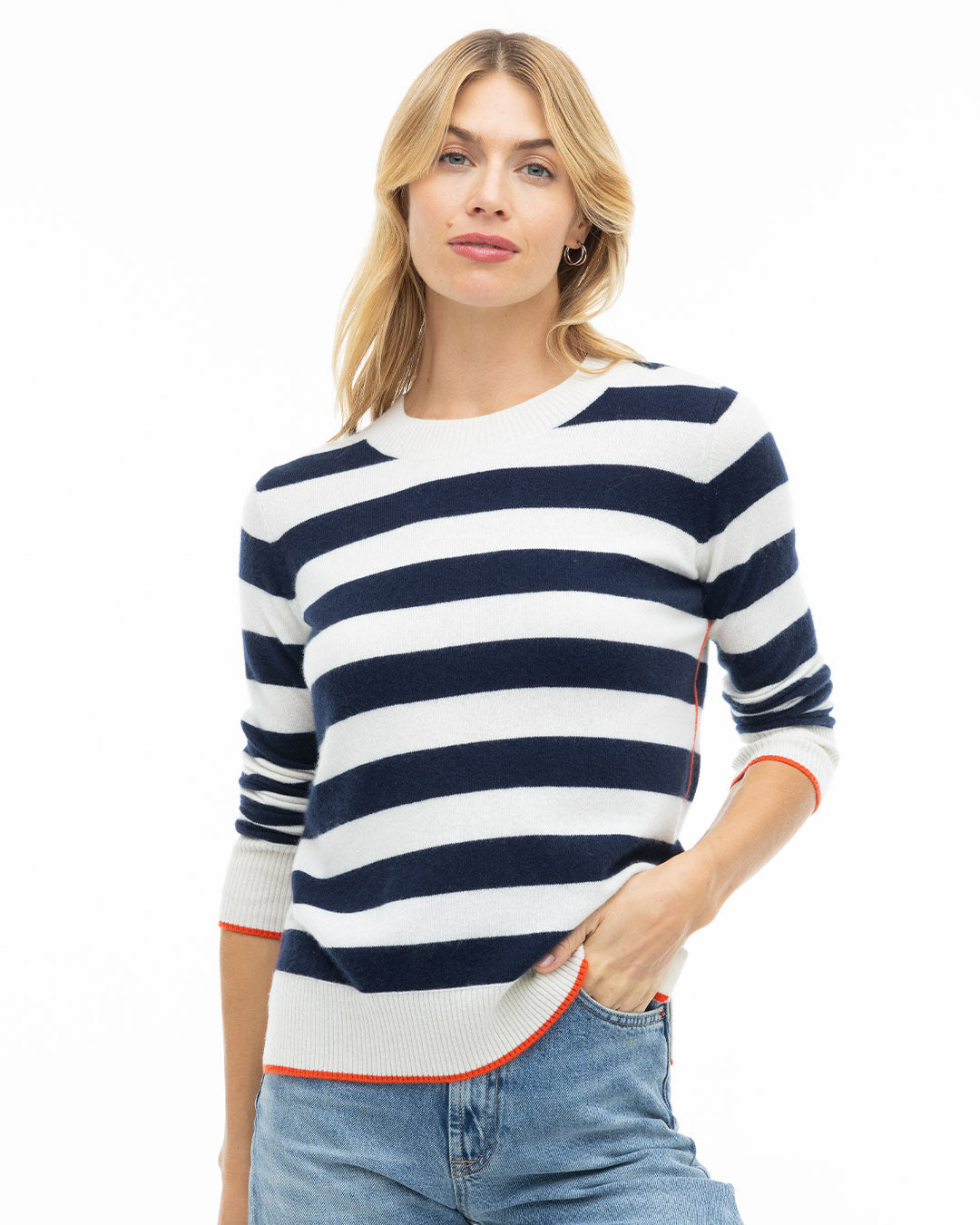 Add a bold touch to your wardrobe with our Contrast Striped Crew, a playful take on classic collegiate style. Crafted from sustainably sourced 100% pure cashmere, its ultra-soft feel meets eye-catching two-color stripes and contrast piping for a vibrant, statement-making look. Energetic and effortlessly chic, it’s a sweater designed to stand out.