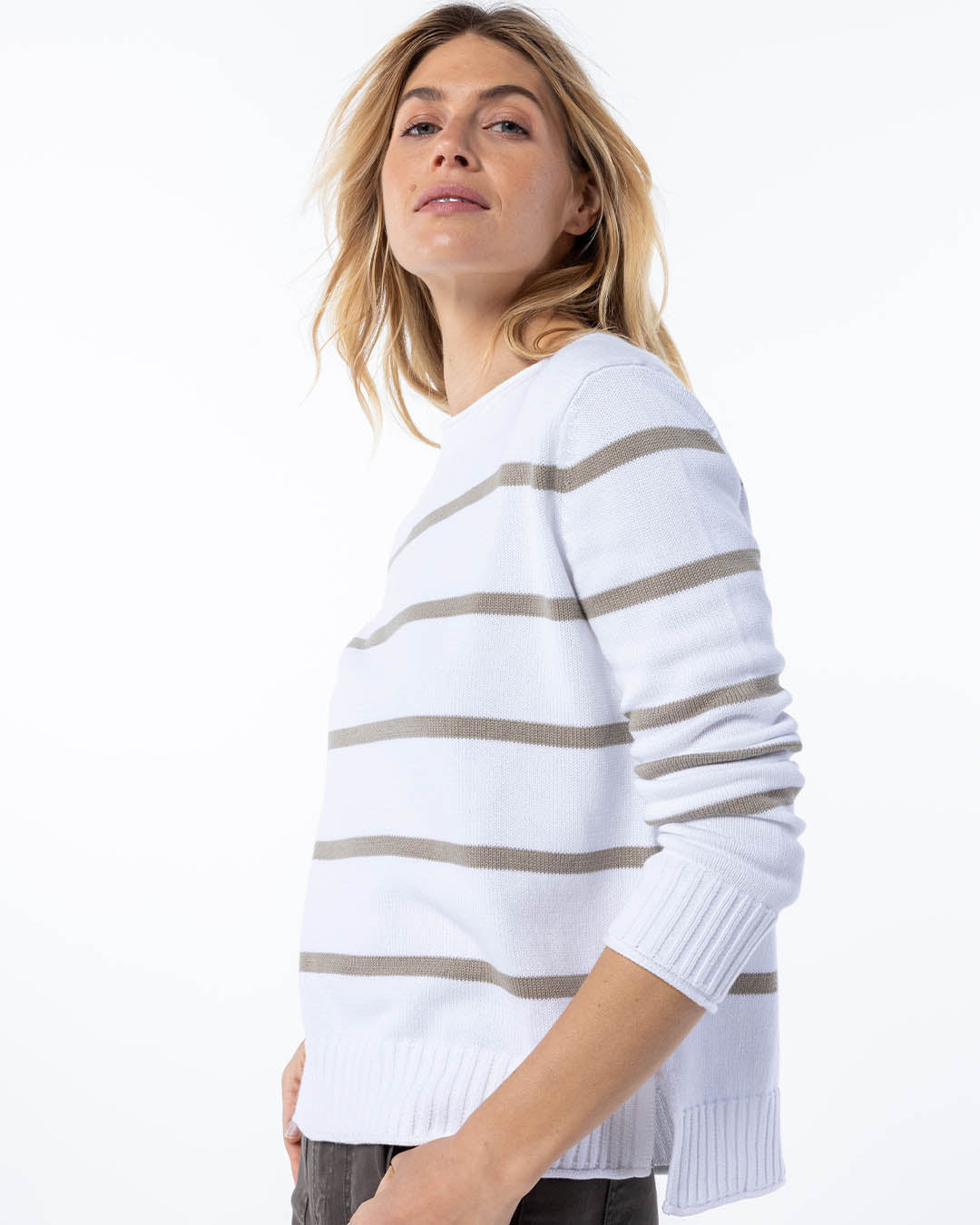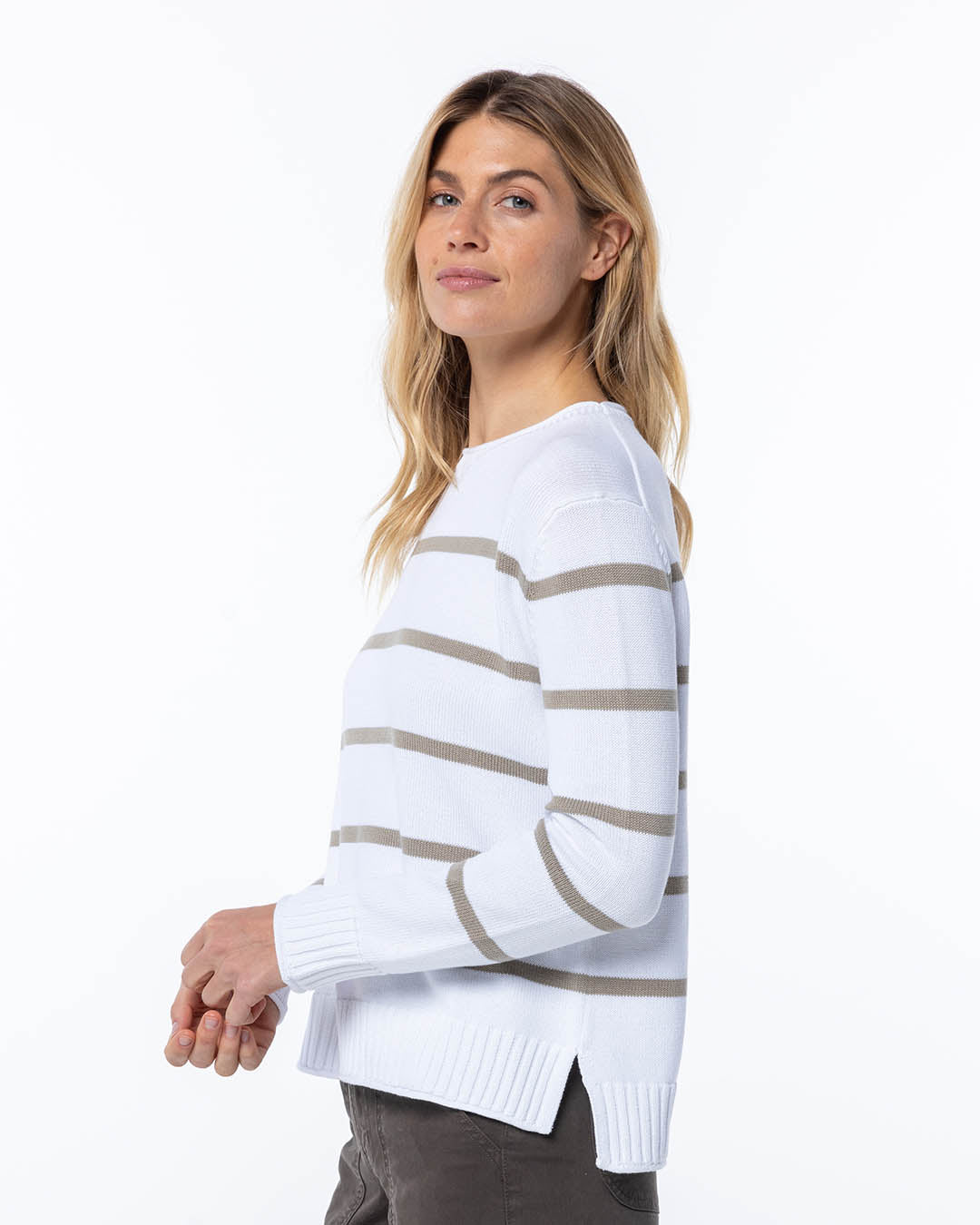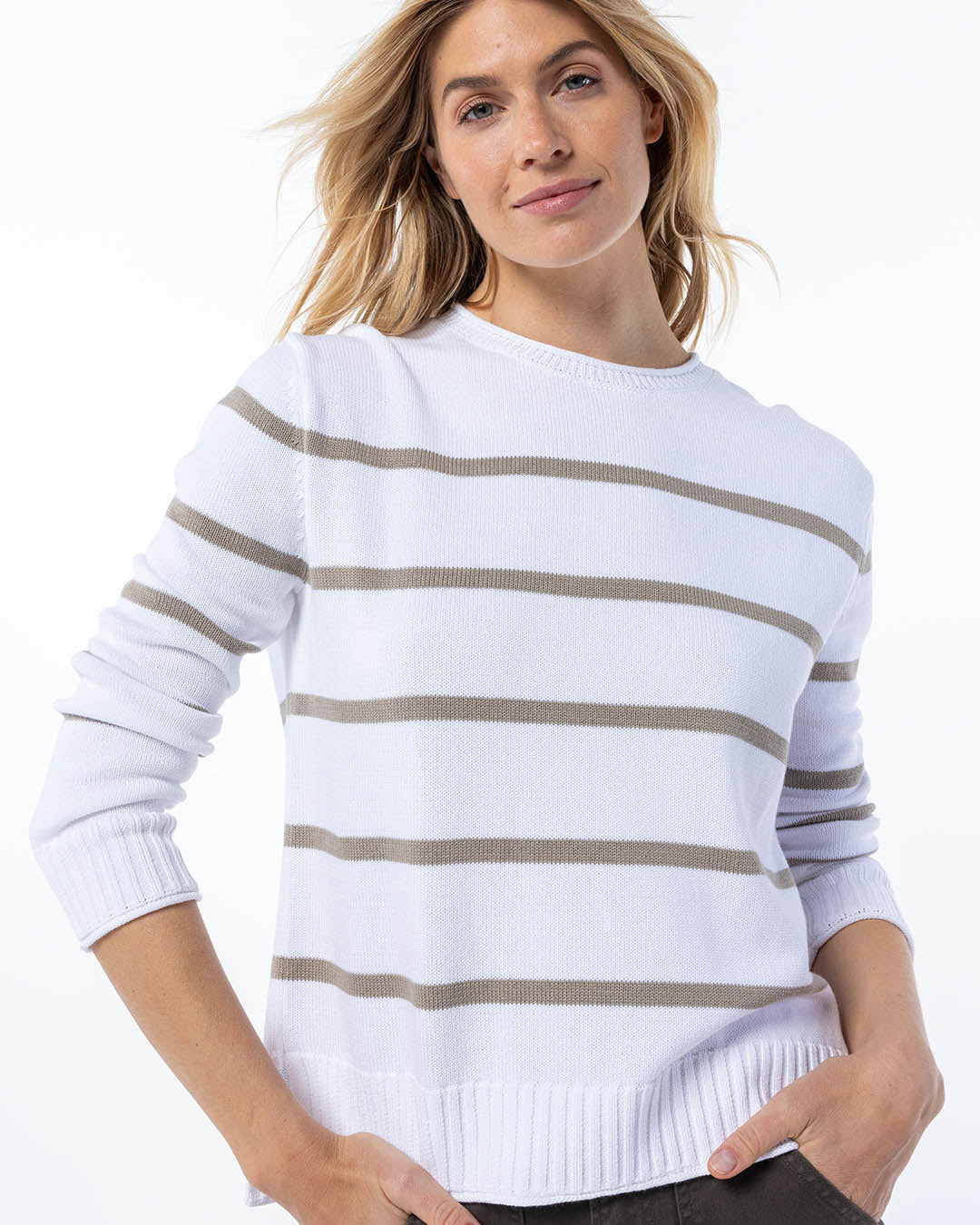 Whether you're strolling the beach or layering up on a crisp evening, the Everyday Cotton Crew is your go-to for year-round comfort. Made from 100% American-grown Supima™ cotton, this ultra-soft sweater features a relaxed silhouette, roll-edge details, and side slits for effortless movement. Available in classic solids and striped hues like navy/white and white/french blue, it’s a must-have for laid-back yet polished style.