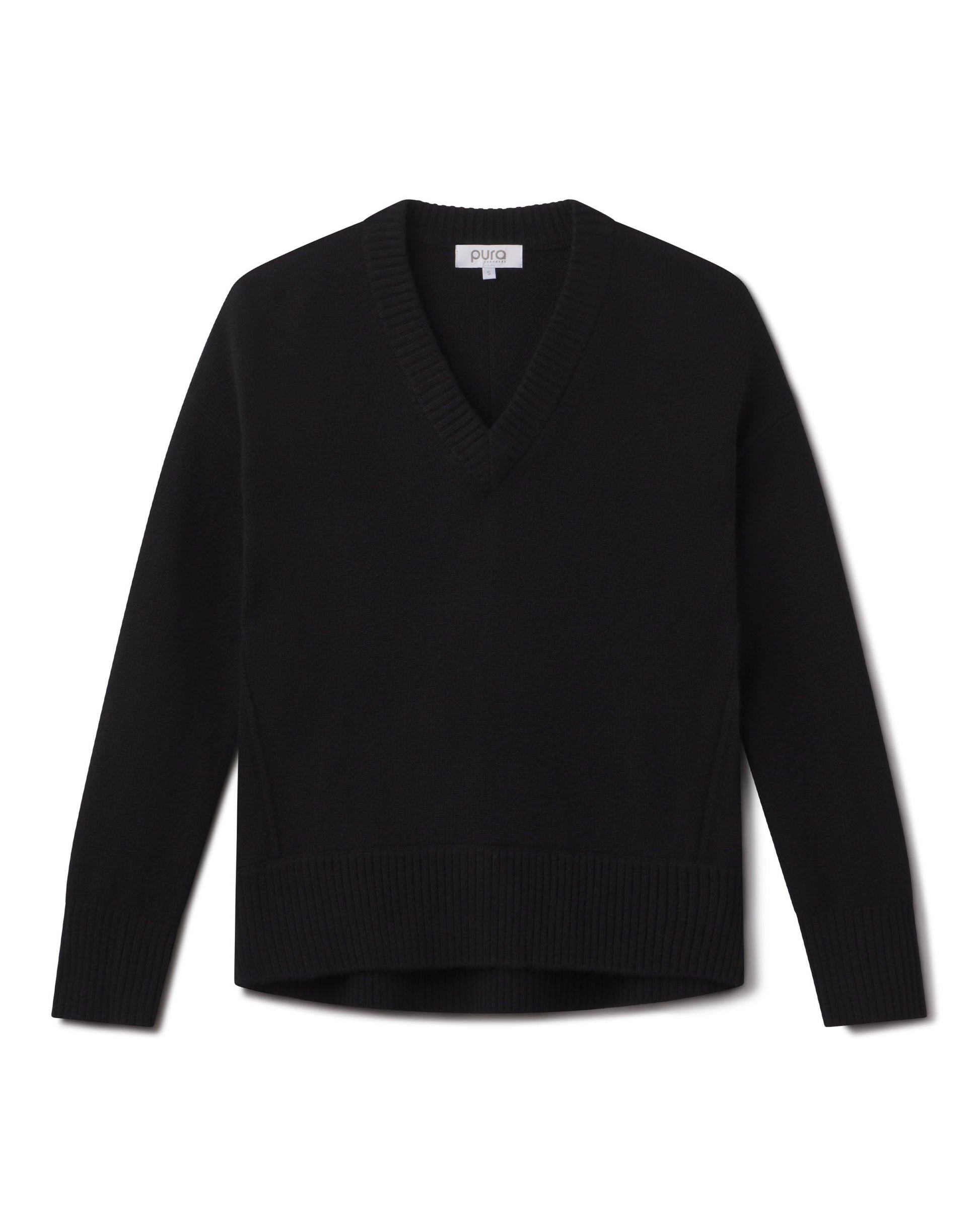 Clean lines with a quiet edge. Knit from 100% Royal Cashmere, this V-neck balances an easy, body-skimming silhouette with substantial rib trims that hold their shape. Forward-set seamwork sharpens the look, while a center-back seam and slightly longer back hem create a smooth, elongated line. Made to layer effortlessly—from a simple tee to tailored separates.