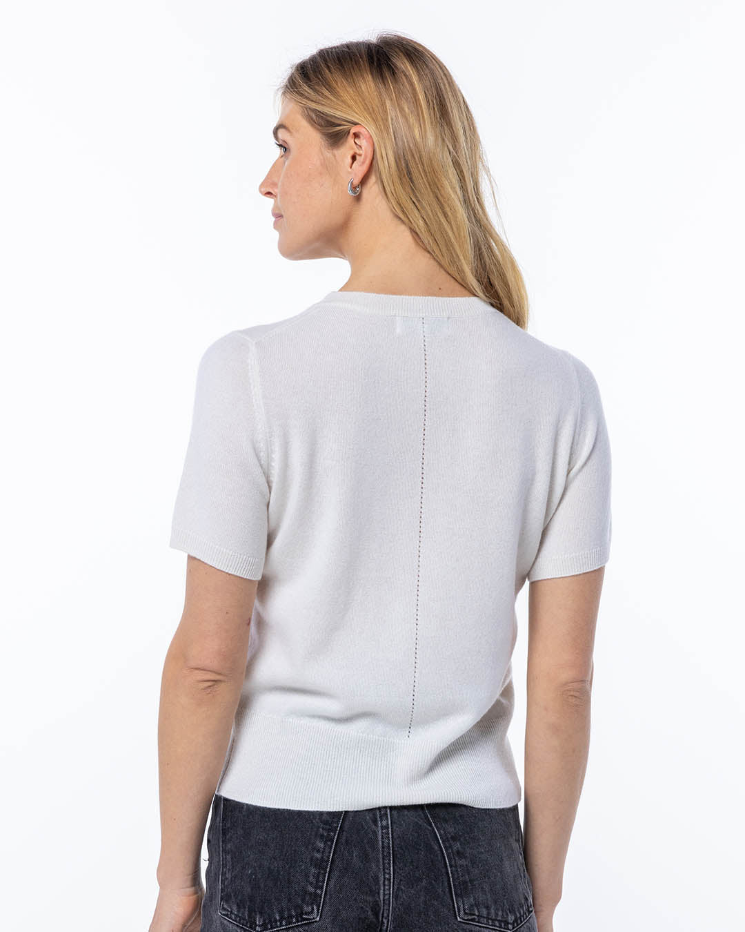Light, soft, and endlessly versatile, this cashmere short sleeve crew is the perfect finishing touch to any look. Wear it solo for a laid-back feel or layer it under a blazer or cardigan for instant polish. With a delicate pointelle back detail, it’s an easy way to add luxury to your everyday style.
